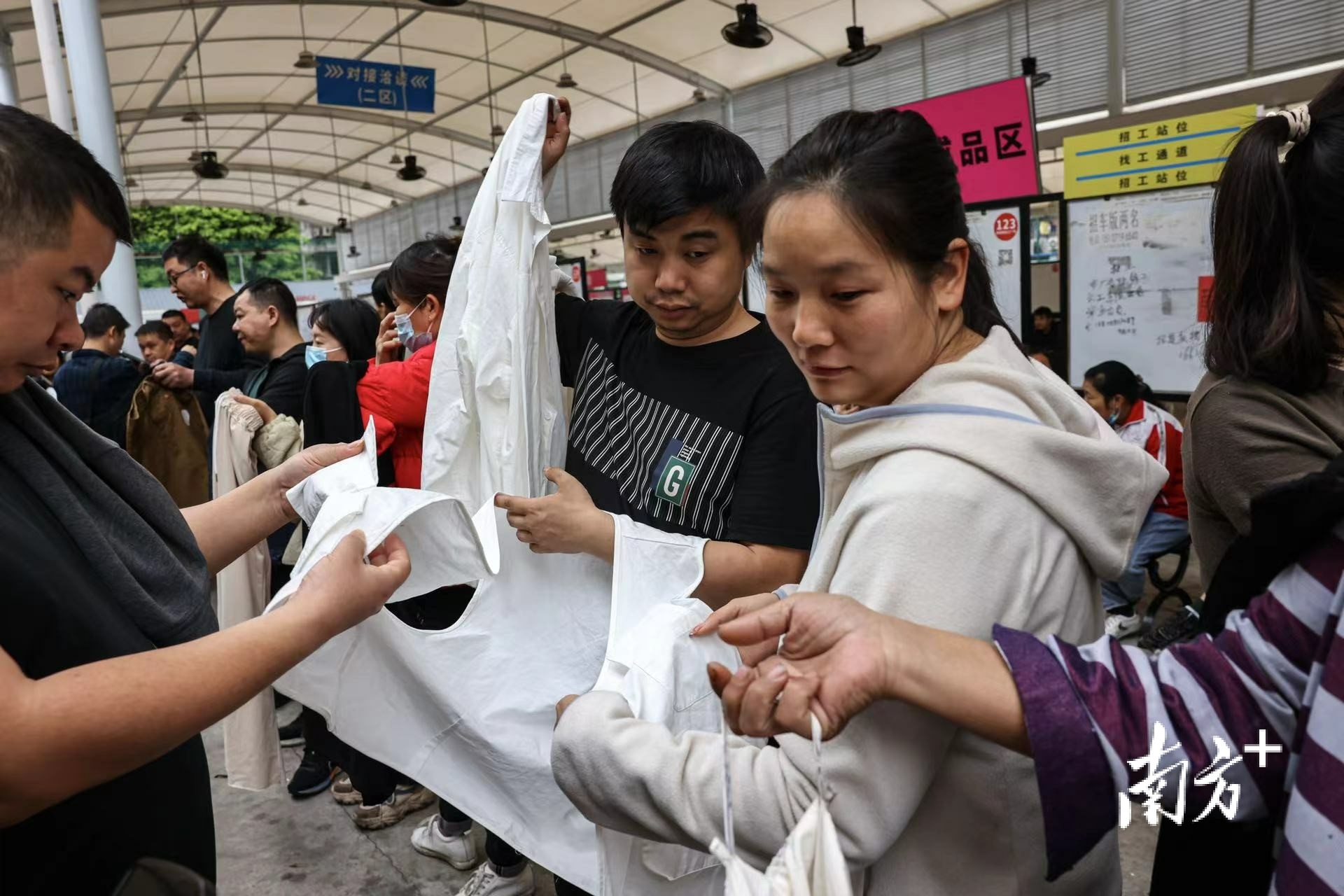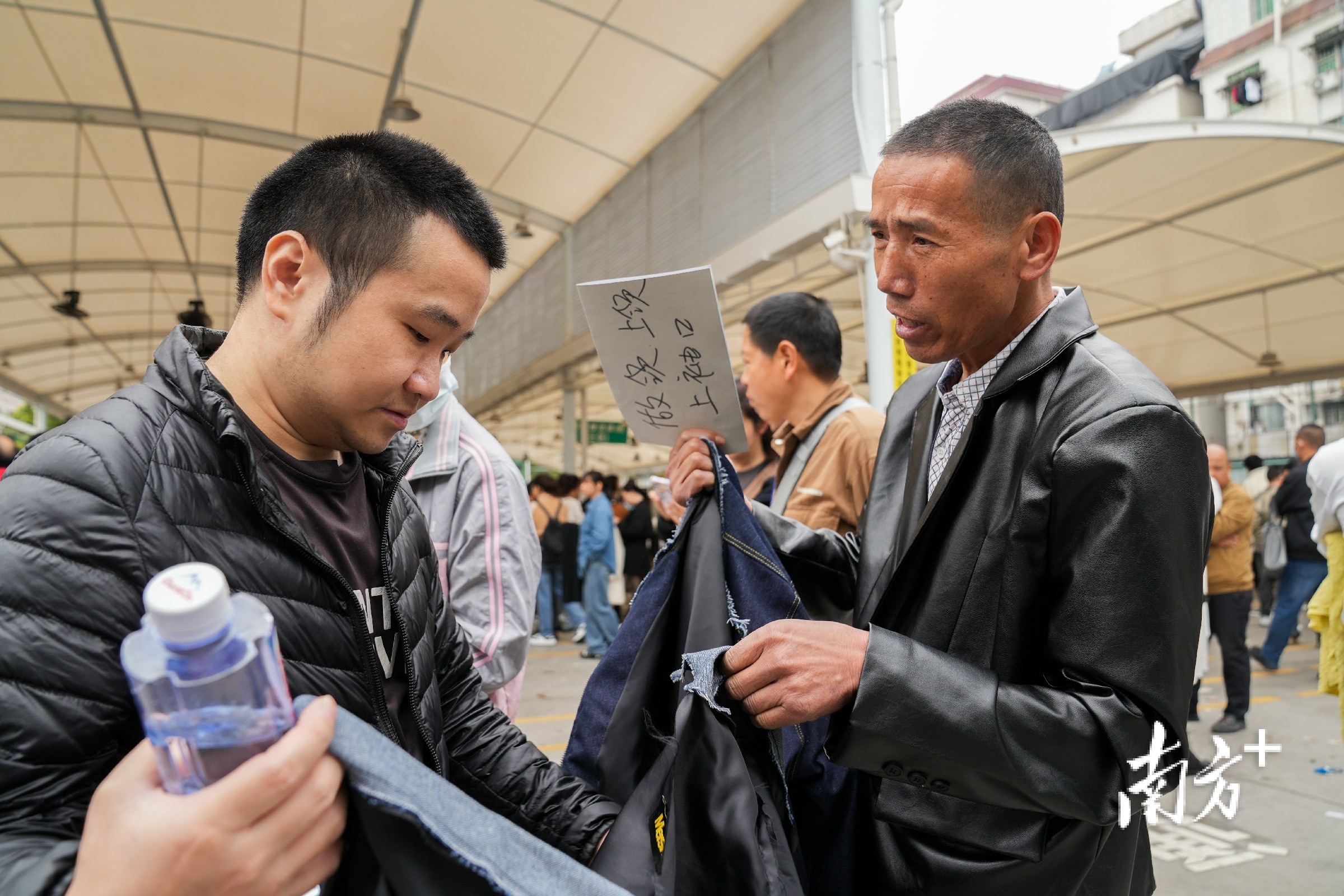 康鹭新招工广场,制衣厂老板们拿着样衣与工人面对面交流。