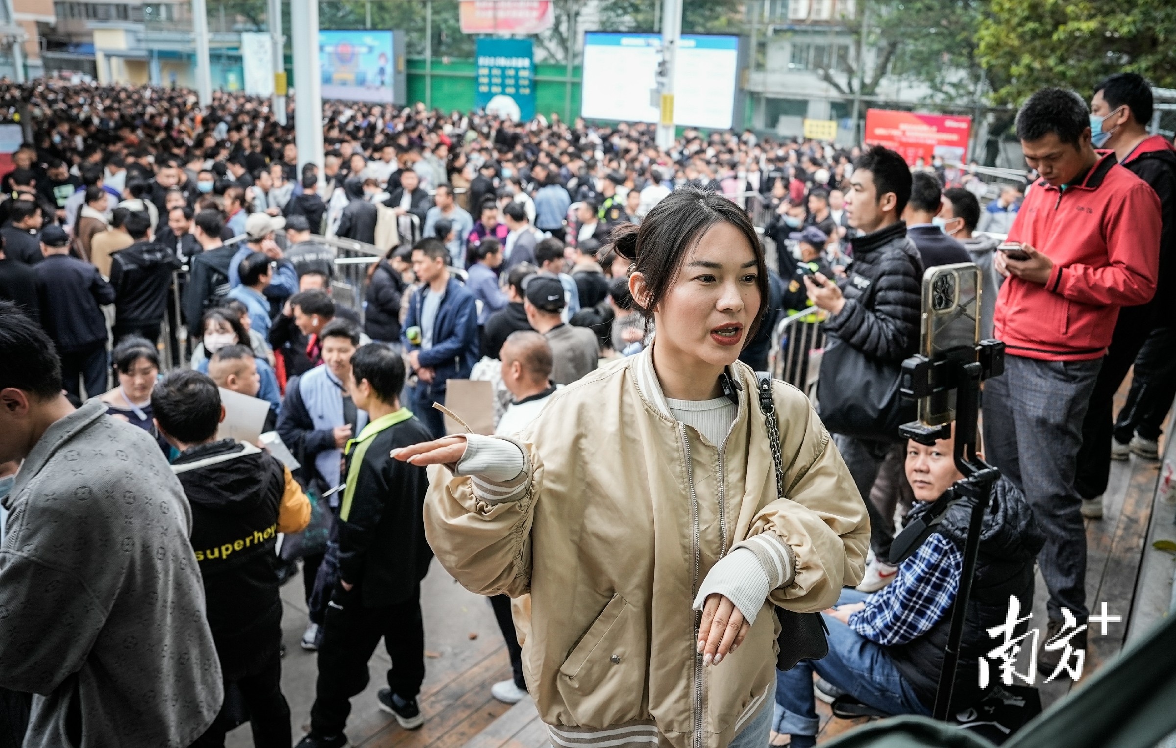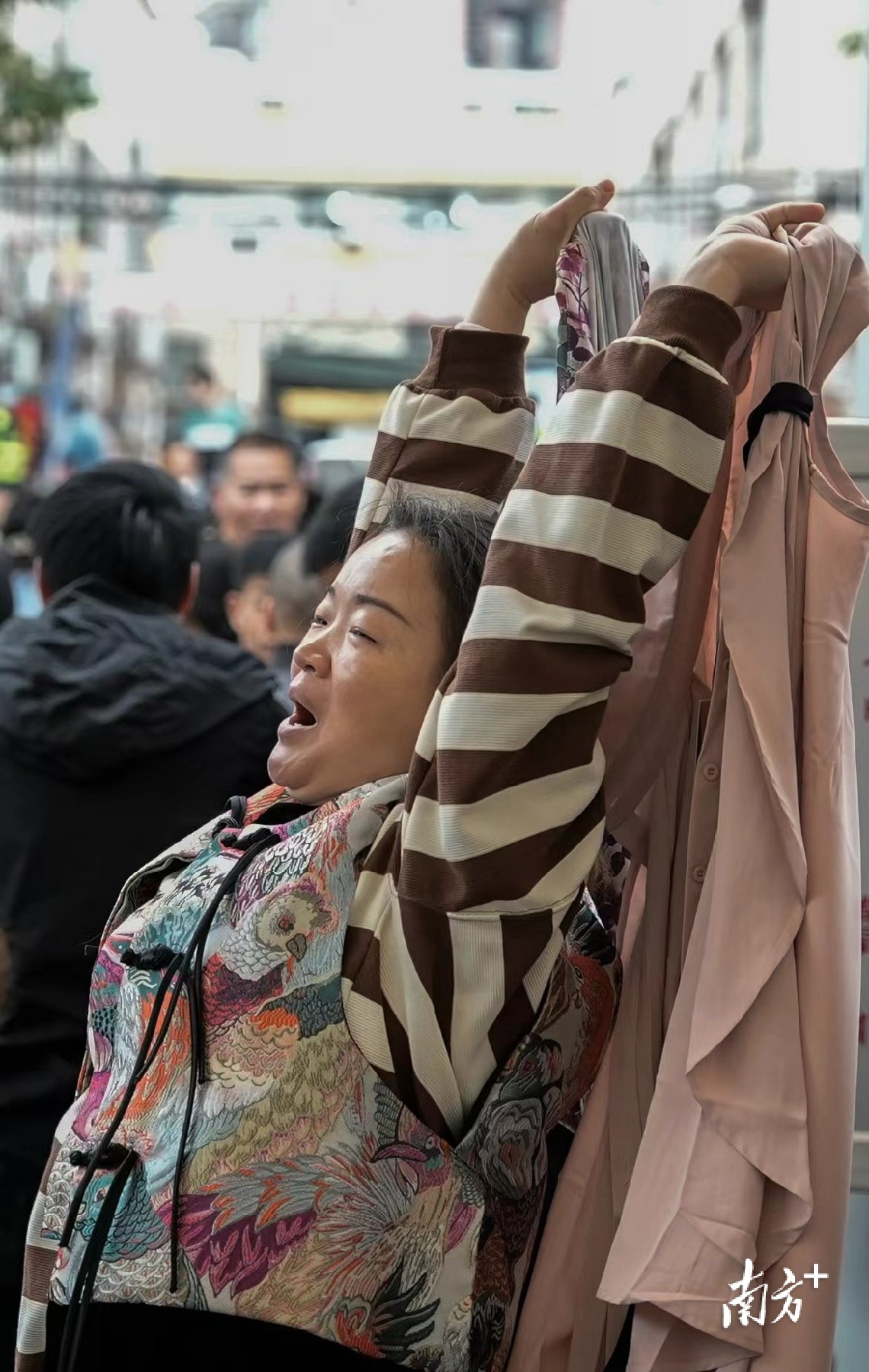 招工广场内的火热,吸引了一些服装从业者前来直播。