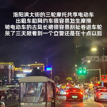 谨慎租车或者自驾,不然你会被洛阳交通整奔溃。洛阳景区周边布满了上万辆三轮车和上万辆共享单车,他们不看红绿灯,不带安全帽,穿着古风长裙在街道穿梭,基本每个出租车网约车司机都在抱怨洛阳交通乱象,也从来不治理。也发生了多起裙摆卷进车轮的时间,仍旧乱象频频。