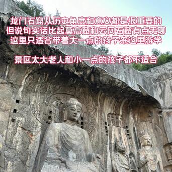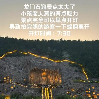 龙门石窟非常大,他不向云冈和敦煌全程下来比较轻松。龙门石窟为了不让景点外露,沿着河道两侧全部都是景点区域,老人小孩走下来非常吃力,如果是喜欢历史和孩子学习可以自己逛,全部下来最少也要两个小时以上,晚上灯光游7:30才全部亮起,大家拍完一蜂拥的离开,摆渡车排队20分钟。